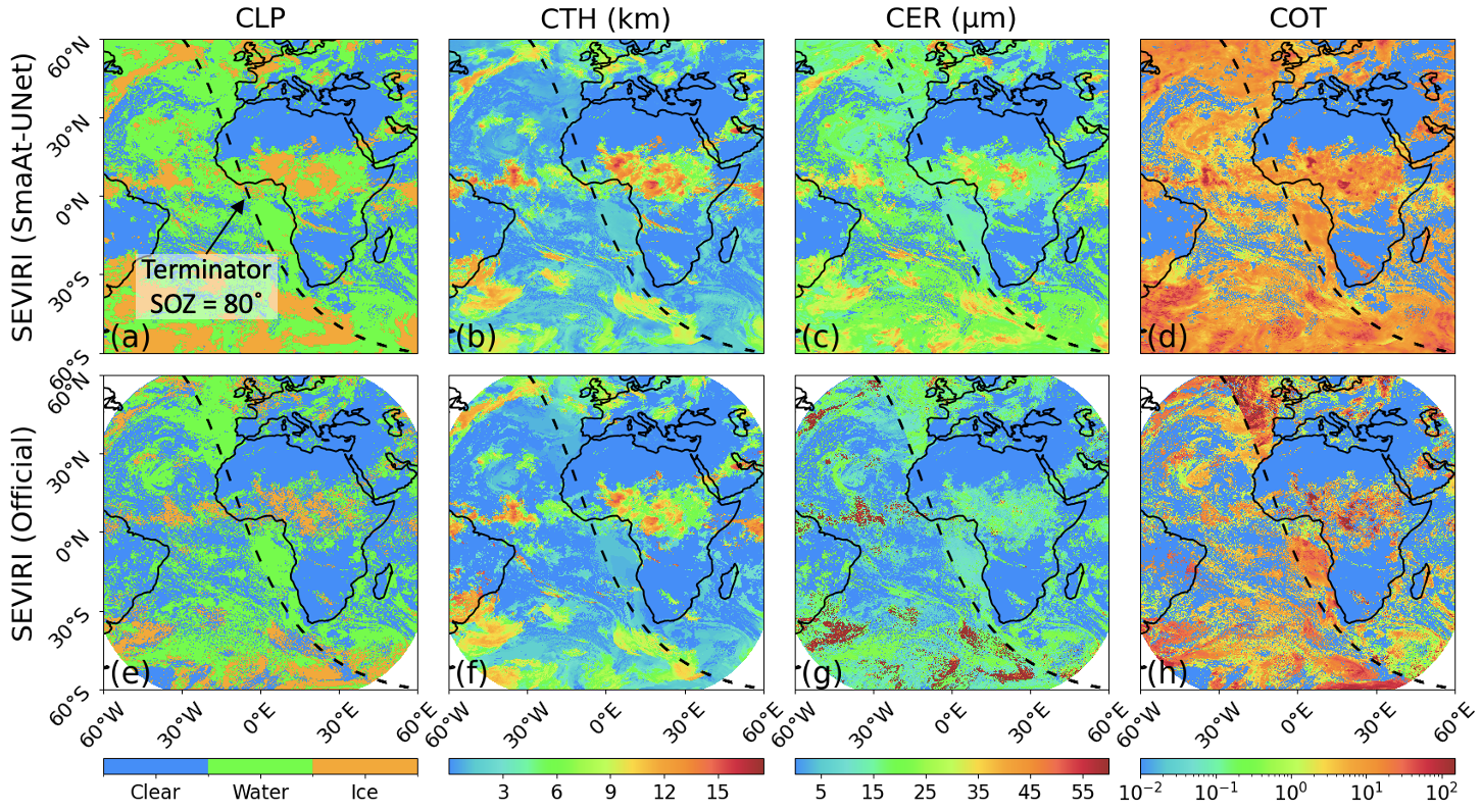 图2. 晨昏线上一致性对比。第一行为 SmaAt-UNet 结果(昼夜连续性好),第二行为SEVIRI官方产品(昼夜差异大)。