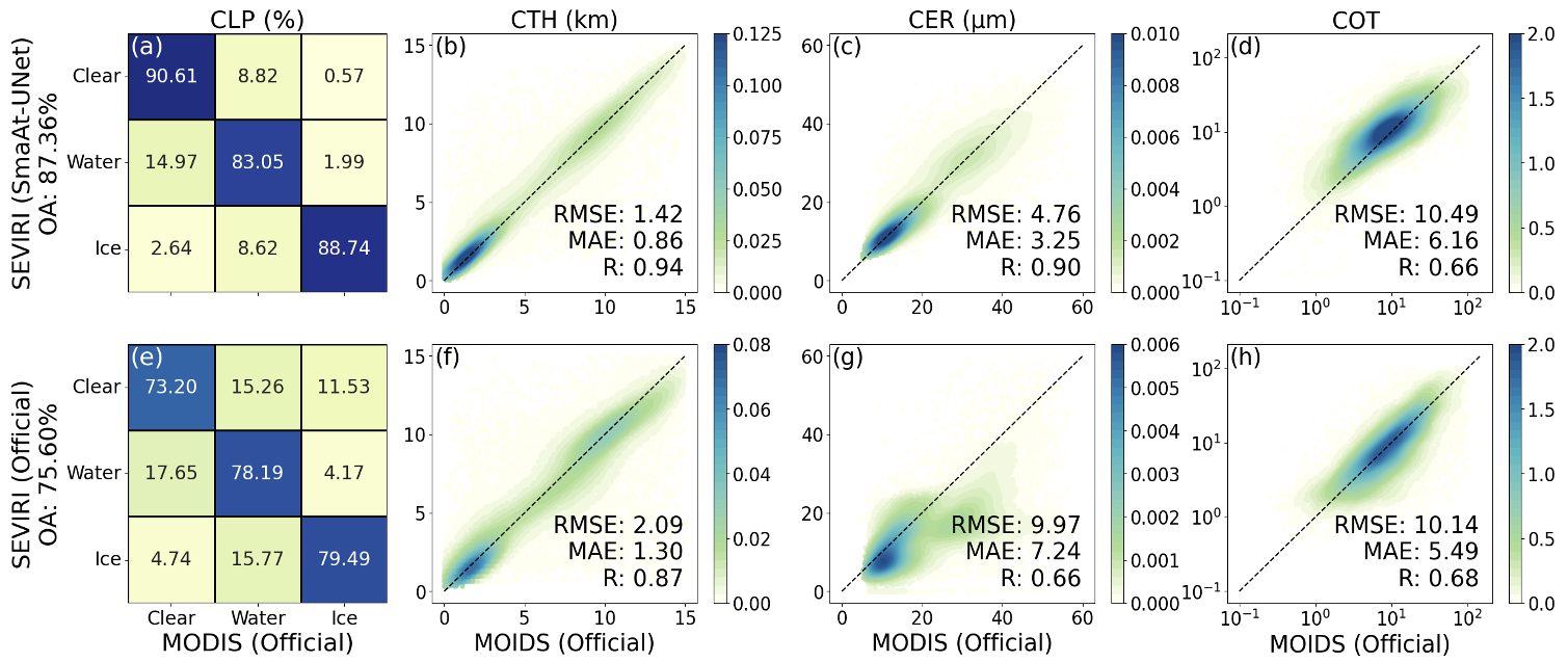 图1. 基于MOIDS官方产品的精度评估。第一行为 SmaAt-UNet 模型精度,第二行为 SEVIRI官方产品精度。