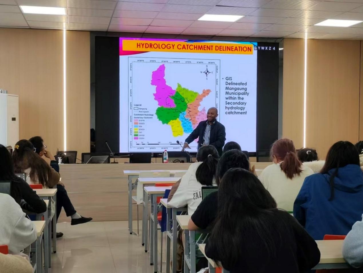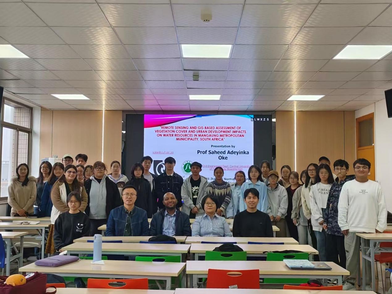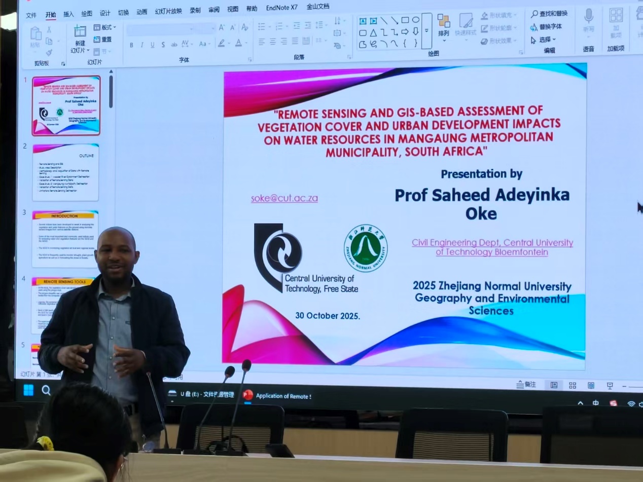 10月30日上午,中国-莫桑比克智慧农业“一带一路”联合实验室荣幸邀请到南非中央理工大学(CUT)Saheed Adeyinka Oke教授,于17幢718会议室为我校师生带来一场题为《基于遥感与GIS的南非曼盖宁大都会植被覆盖评估及城市发展对水资源的影响》的学术讲座,由浙江师范大学地理信息科学专业主任帅艳民教授主持。