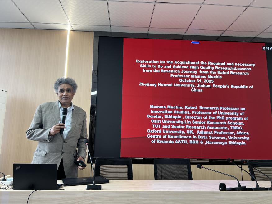 10月31日下午,南非科学院和非洲科学院的院士、南非国家研究基金会(NRF)评级的研究教授Mammo Muchie,应中国-莫桑比克智慧农业“一带一路”联合实验室邀请,为浙江师范大学师生带来题为《获取开展和实现高质量研究所需必要技能的探索:来自知名研究教授Mammo Muchie的研究历程的经验教训》的学术讲座。本次讲座于17幢718会议室举行,由地理与环境科学学院蒋自然老师主持。