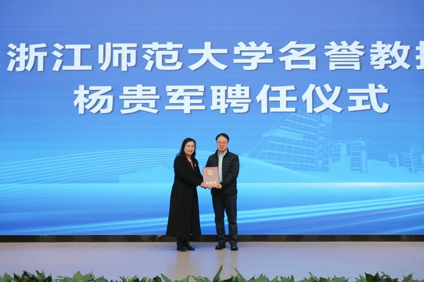 浙师大副校长张建珍向国家农业信息化工程技术研究中心杨贵军教授颁发浙师大名誉教授聘书。浙师大融媒体中心 章克锐 摄